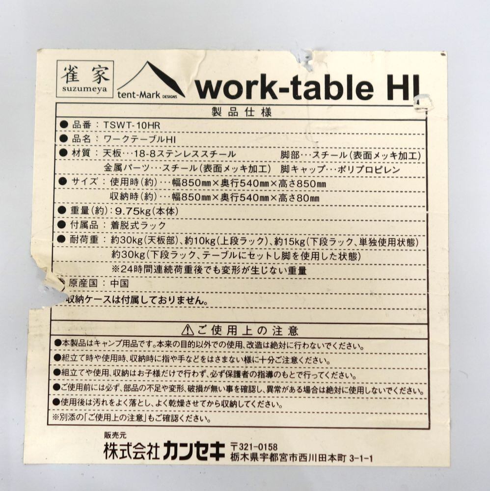 テンマクデザイン tent-Mark DESIGNS ワークテーブルHI TSWT-10HR ステンレス 作業台 テーブル キャンプ アウトドア ce08on-rk26y09891