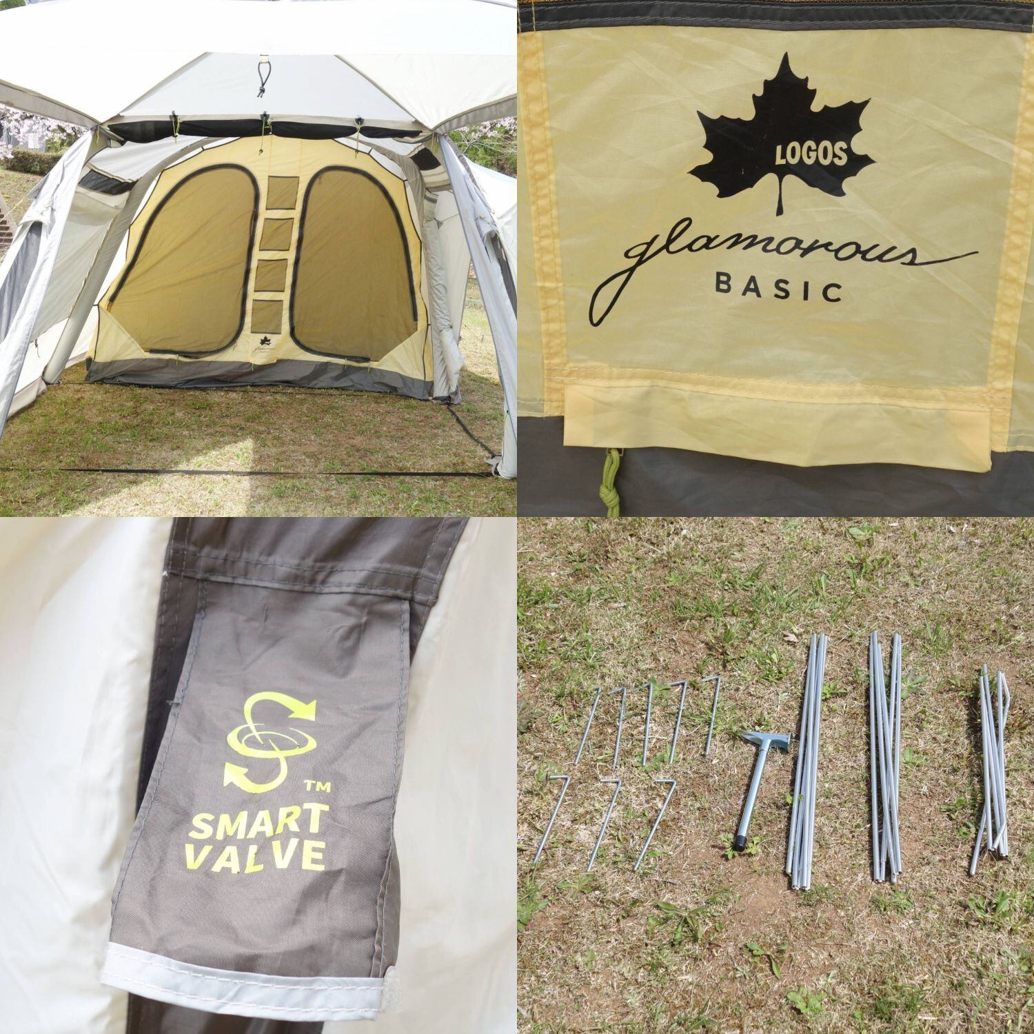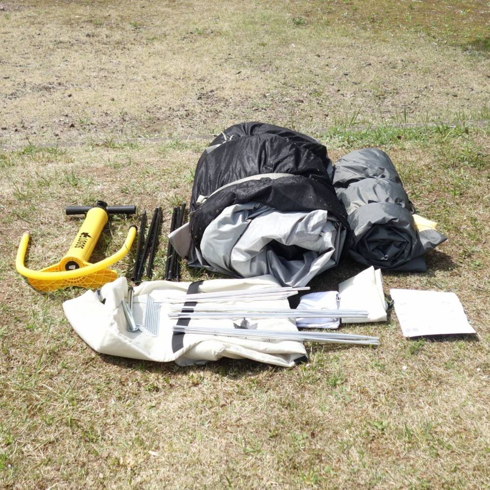・付属品:フライシート、インナーテント、パネルフレーム、リッジフレーム、キャノピーポール、ペグ8本、エアポンプ、ロープ、収納バッグ、フレーム用収納袋、ハンマー、小物袋