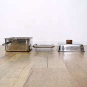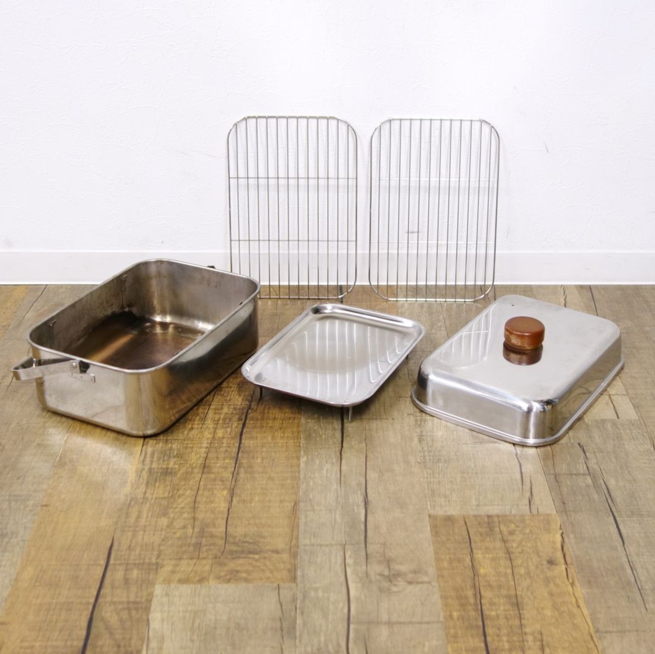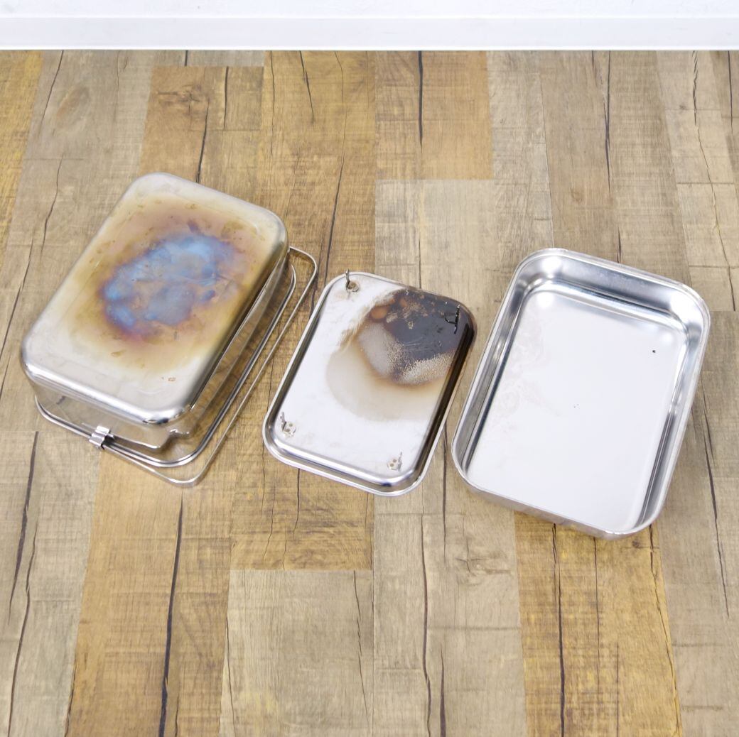 ・鍋底に熱による変色、汁受け皿に焦げ、全体的に汚れがみられます。