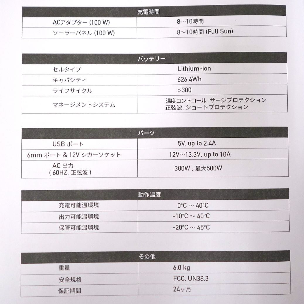 ・出力ポート:ACx1口、DC/シガーx1口、DC/6.5mm(6514)x2口、USB-Ax3口