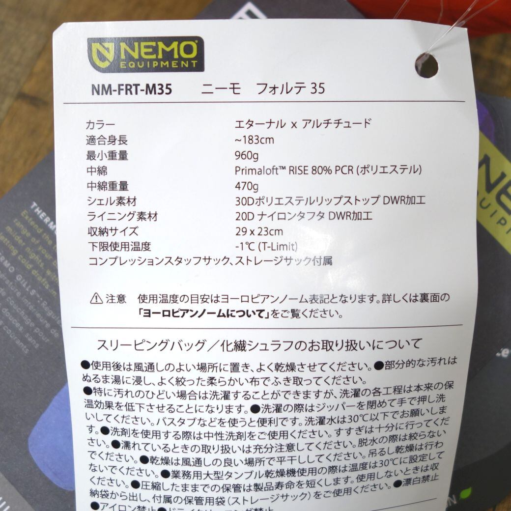 未使用 ニーモ NEMO FORTE 35 フォルテ35 NM-FRT-M35 シュラフ スリーピングバッグ 寝袋 寝具 キャンプ 登山 アウトドア