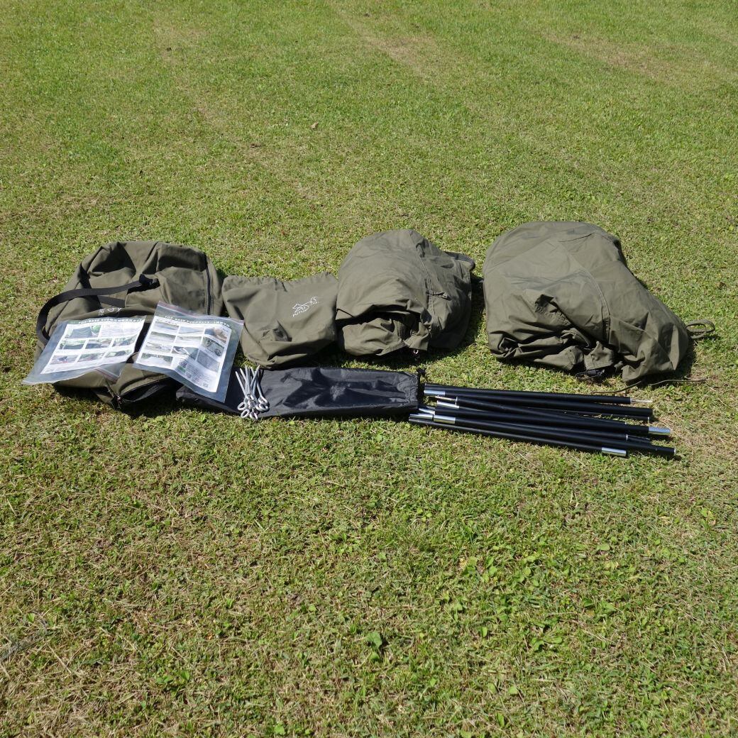 【付属品:本体・ポール4本・ペグ10本・自在ロープ・取扱説明書・前幕・グランドシート・収納ケース】