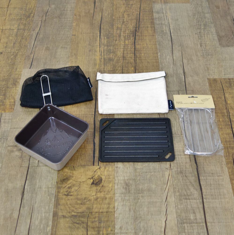 ・セット内容:ZERO GRAM ラーメンパン セラミックプラス、テンマクデザイン 男前グリルプレート、トランギア メスティン用SSメッシュトレイ
