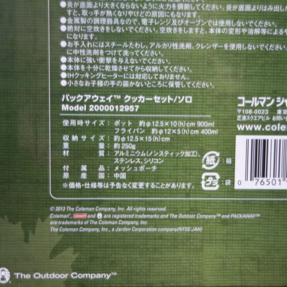 ・Coleman パックアウェイクッカーセットソロ:型番2000012957