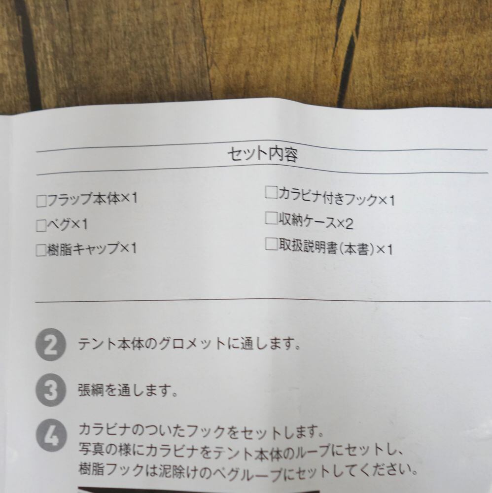 【付属品:フラップ本体・ペグ×1・樹脂キャップ・カラビナ付きフック・説明書・収納ケース】